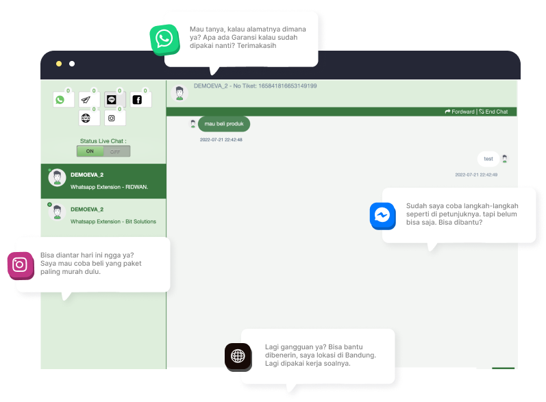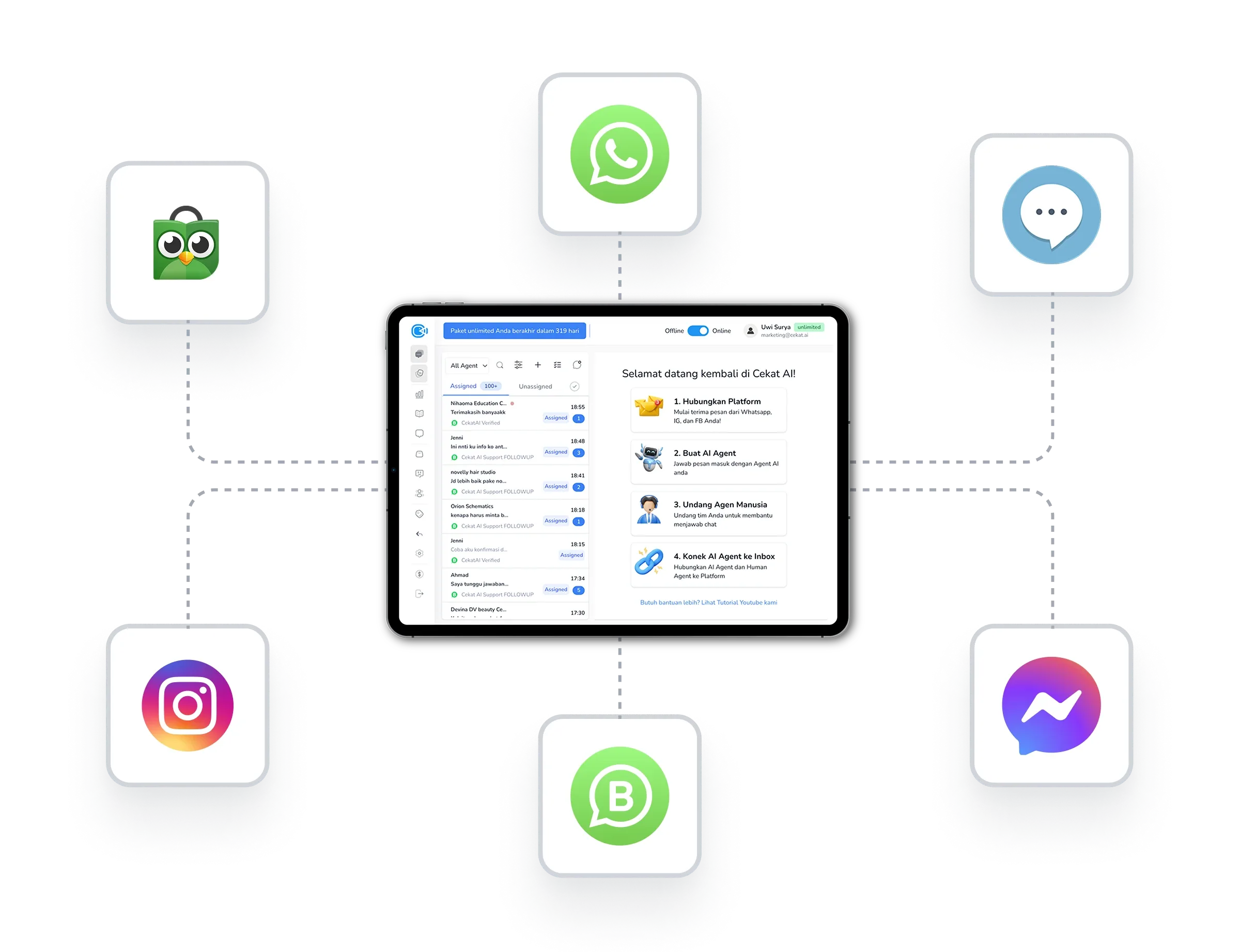 Disini kamu bisa menghubungkan semua perangkat whatsapp dan platform sosial media, semua chat dalam satu dashboard.