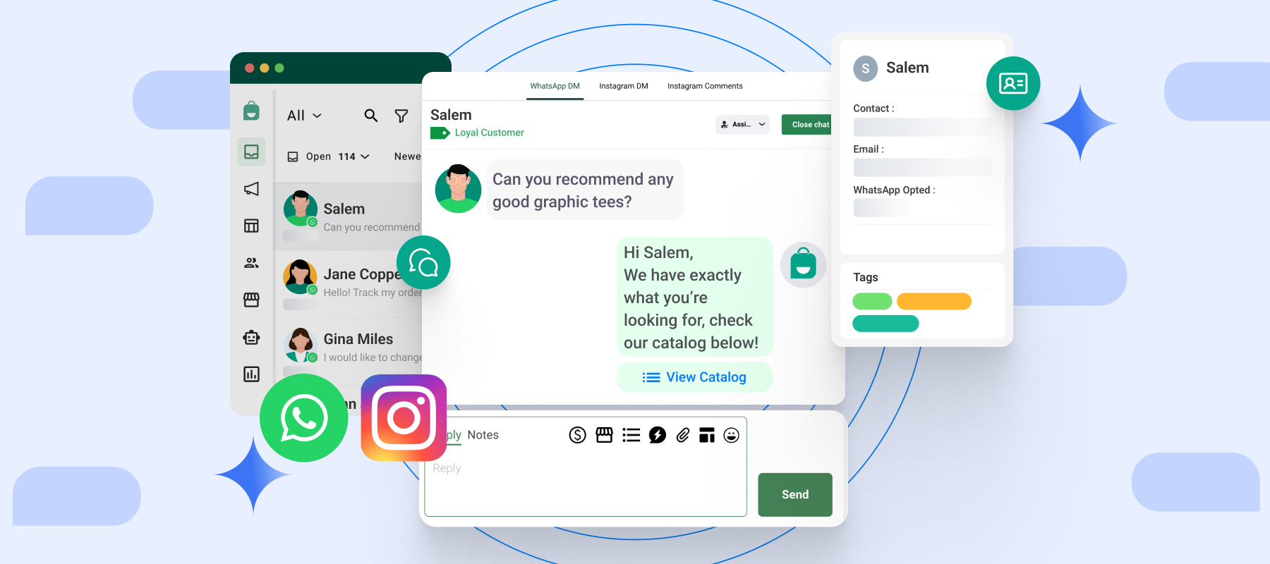 Kamu bisa balasin Chat dalam 1 halaman, semua chat dari semua device whatsapp, akun Fb, IG dan live chat web masuk dalam 1 dashboard. segampang itu anda bisa langsung broadcast dan balasin chat